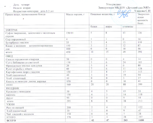 Дети в детском саду обеспечены 4-х разовым сбалансированным питанием в соответствии с режимом дня. Режим питания детей с 12-ти часовым пребыванием включает: завтрак, обед, полдник, ужин.