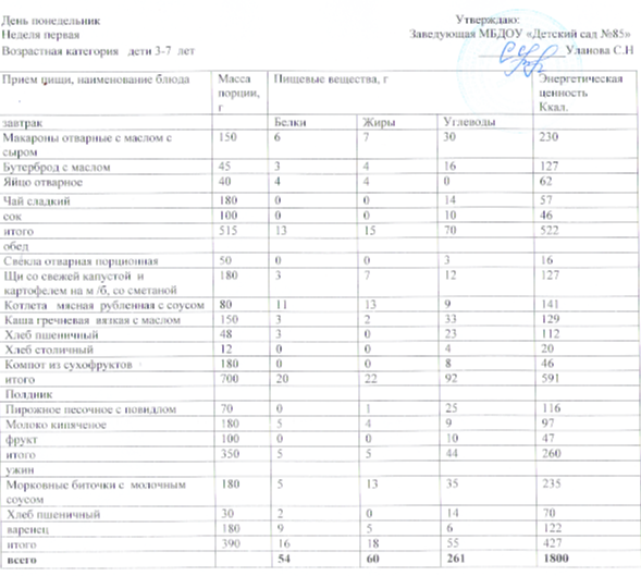 Питание осуществляется в соответствии с основным (организованным) меню, разработанным в соответствии с требованиями и рекомендациями СанПиН 2.3/2.4.3590-20. Объем пищи и выход блюд соответствуют возрасту детей. В рационе присутствуют свежие фрукты, овощи, соки, кисломолочные продукты.